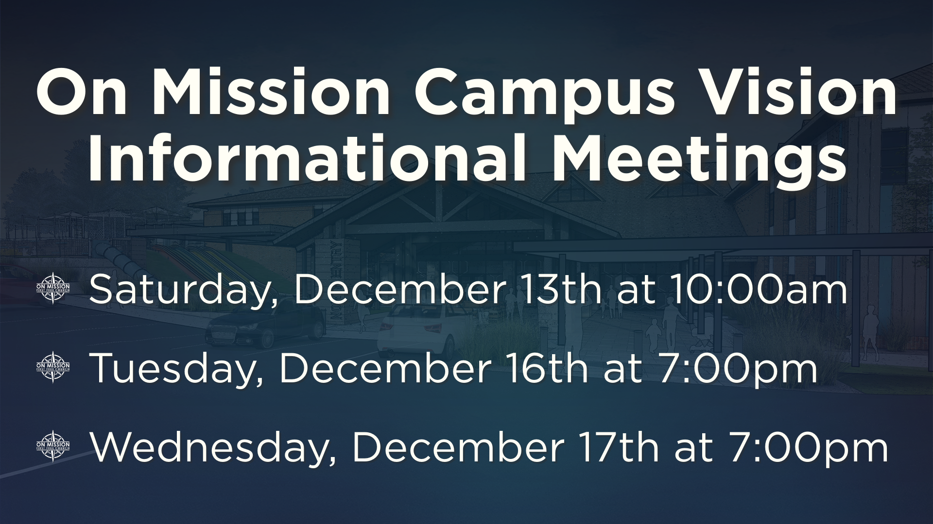 Join us for one of our upcoming On Mission Campus Vision Informational Meetings to hear an exciting update on where God is leading us as a church. We’ll walk through the future campus master plan, share the heart behind these proposed improvements, and provide space for questions and conversation.These meetings are designed to help our […]